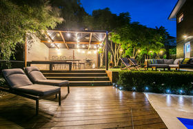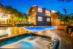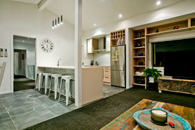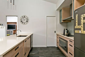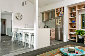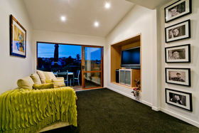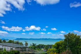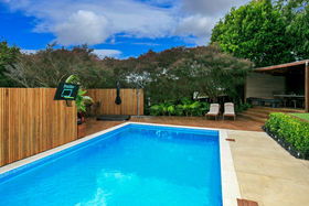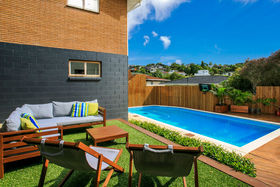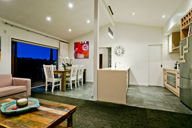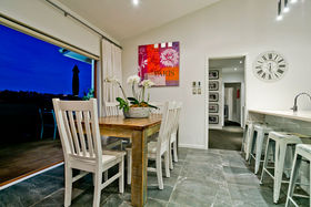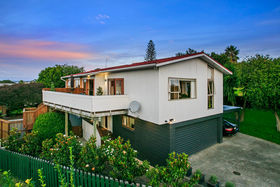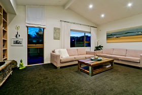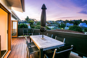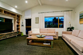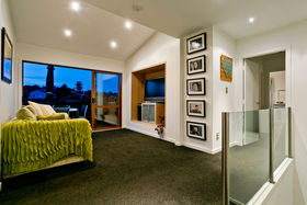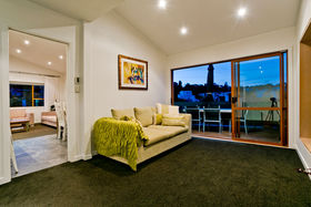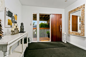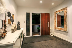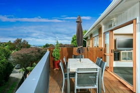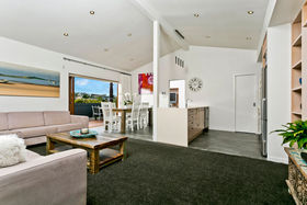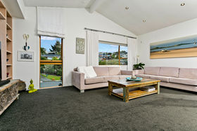 Warm, sunny and quiet, and situated in a tree-studded cul-de-sac with the soothing sounds of wood pigeons and tuis in the air, the home offers dreamy ocean views from the upper level deck - the perfect setting for morning coffee or end of day cocktail.
